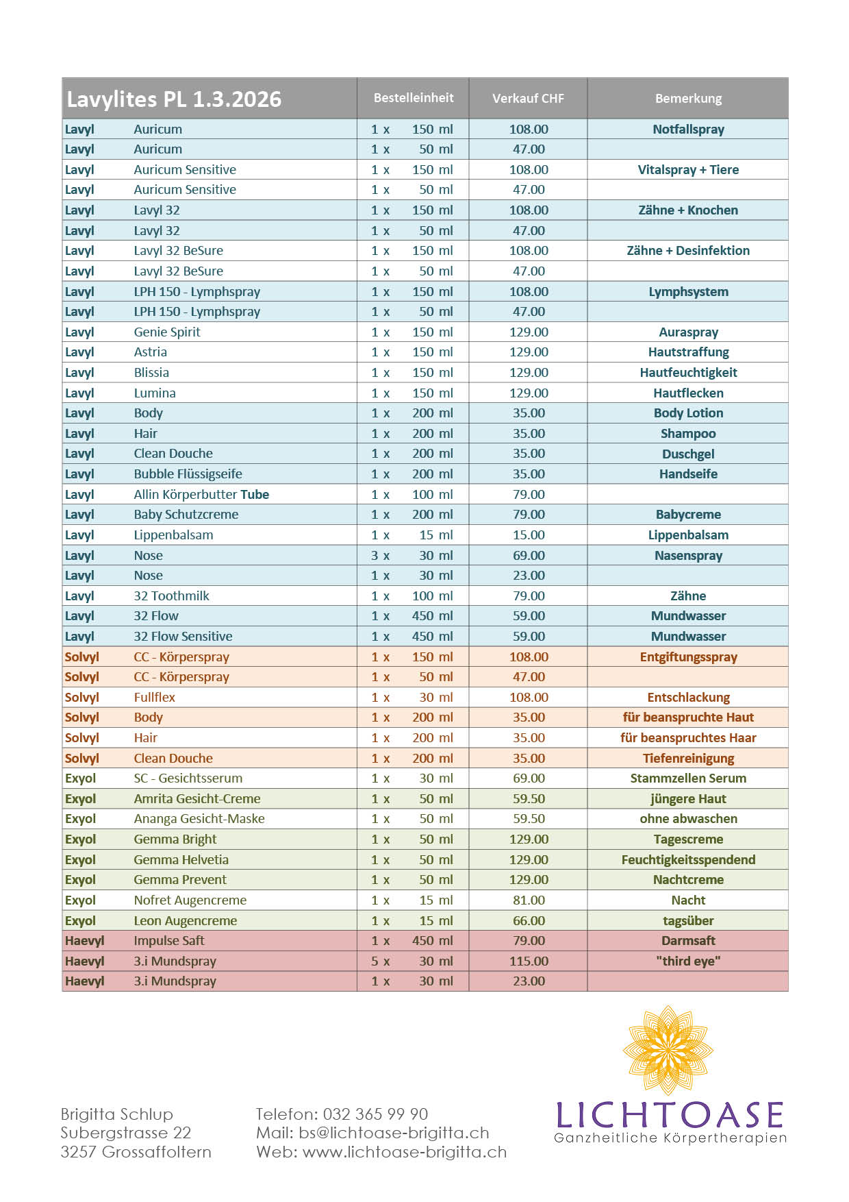 Lavylites Preise Lavylites Preise Verkaufspreisliste Lavylites Essenzen Versand: Per A-Post nach ZahlungseingangZahlung: VorauskassePorto: CHF 11.00